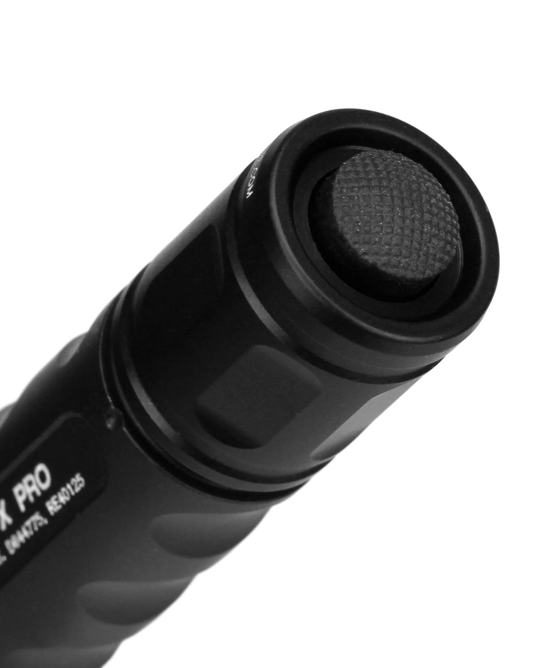 – Endkappenschalter mit zwei Leuchtstärken: für Momentlicht drücken, für schwaches Dauerlicht einrasten lassen; für starke Leuchtkraft ausschalten und erneut drücken/einrasten lassen