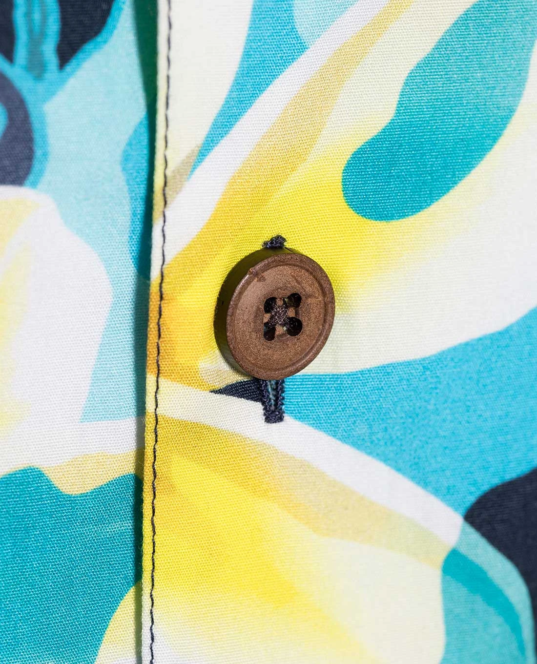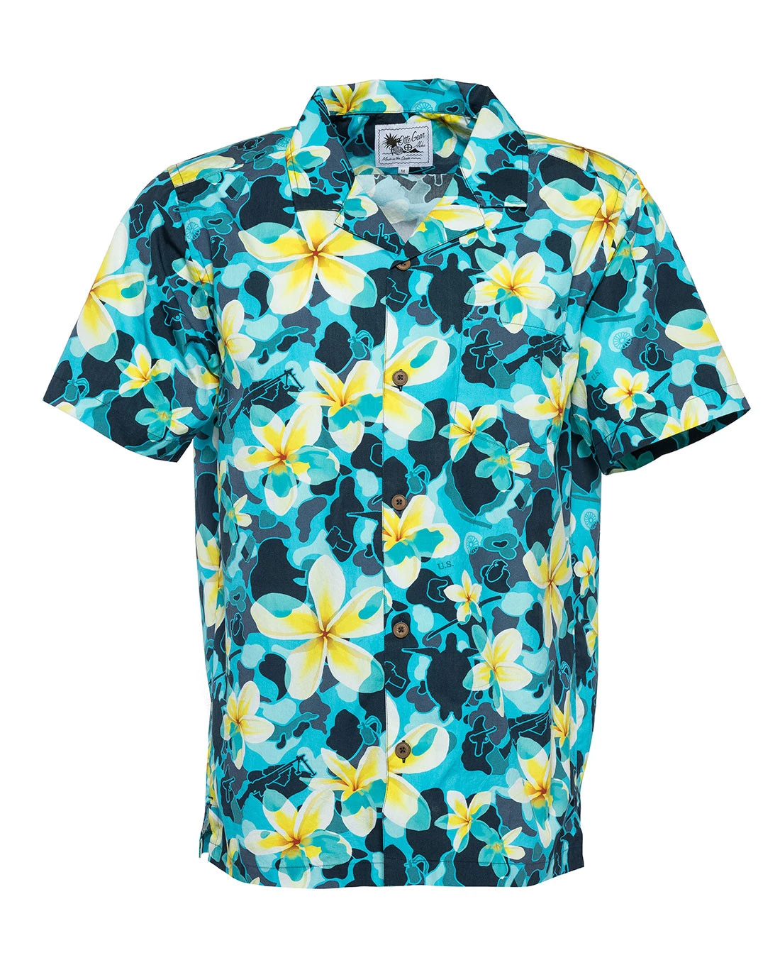 Inspiriert von der Hawaii-Hemden-Mode der 1970er Jahre hat das Aloha Pua Honu einen angeschnittenen Kragen und Knöpfe aus Kokosnussschalen.