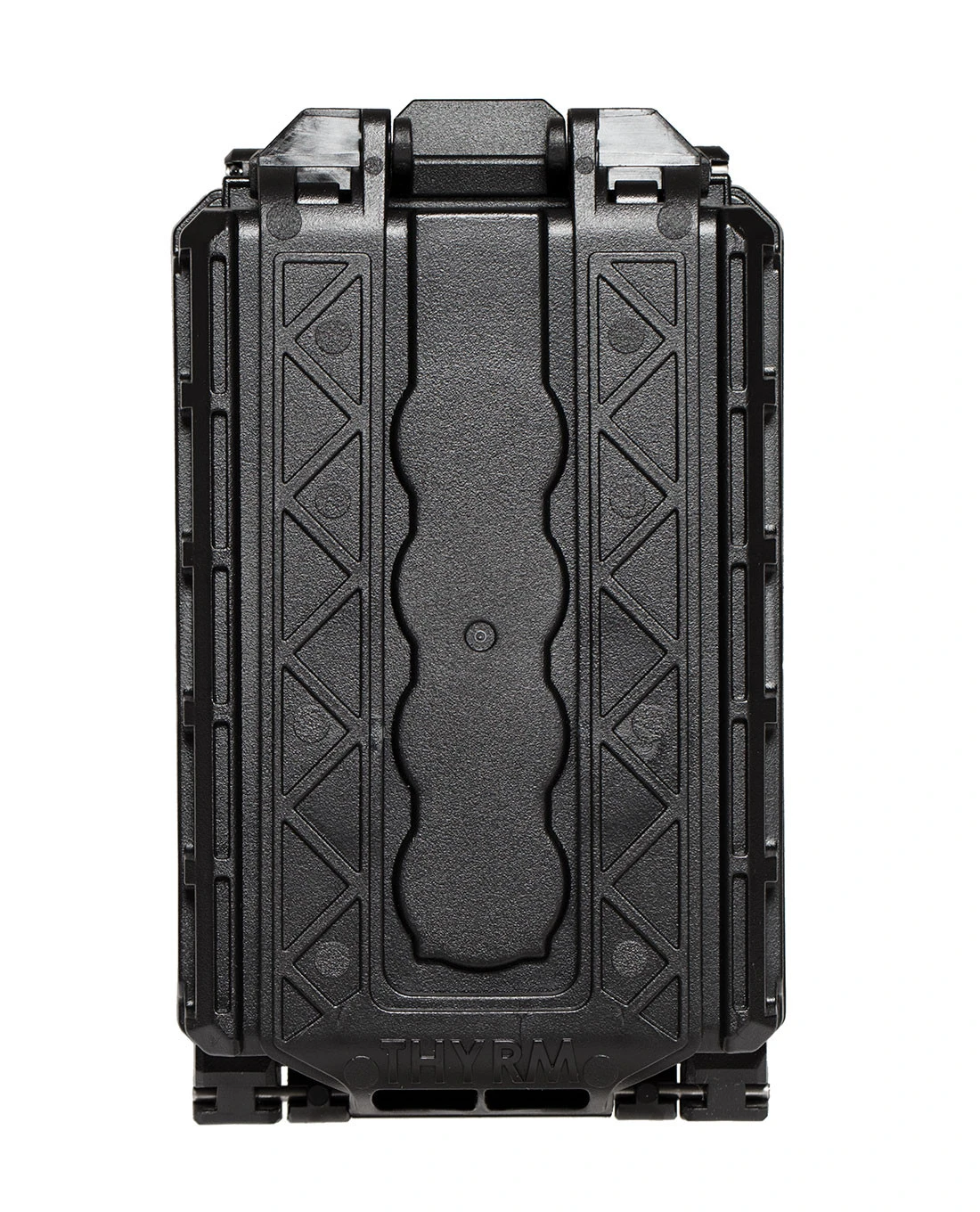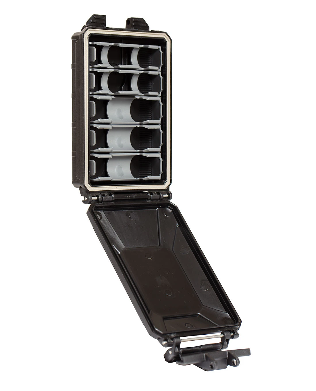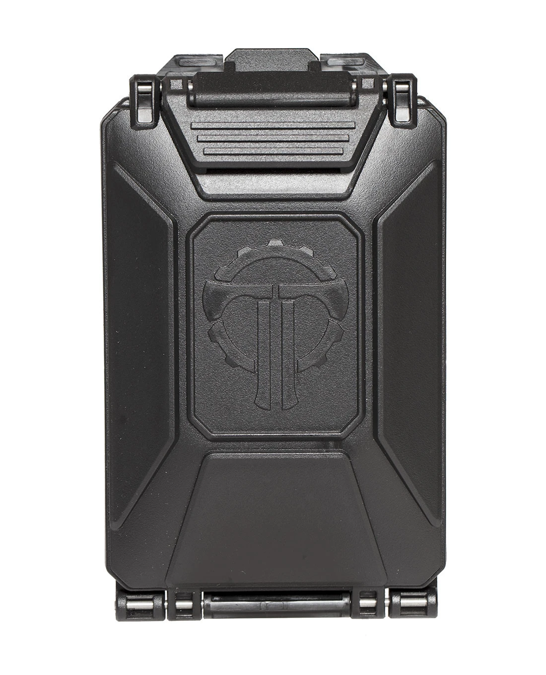 Das CellVault-5M Modular Battery Storage wird aus einer Premium-Polymer-Konstruktion gefertigt und ist mit einer wasserdichten Dichtung versehen. Zur Sicherung des Inhalts kann der flache Riegel, der über der Mitte liegt, abgeschlossen werden. Für die Befestigung an Eurem Rucksack oder Eurer Gear kann das Case mit dem mitgelieferten Riemen am M.O.L.L.E-System befestigt werden.