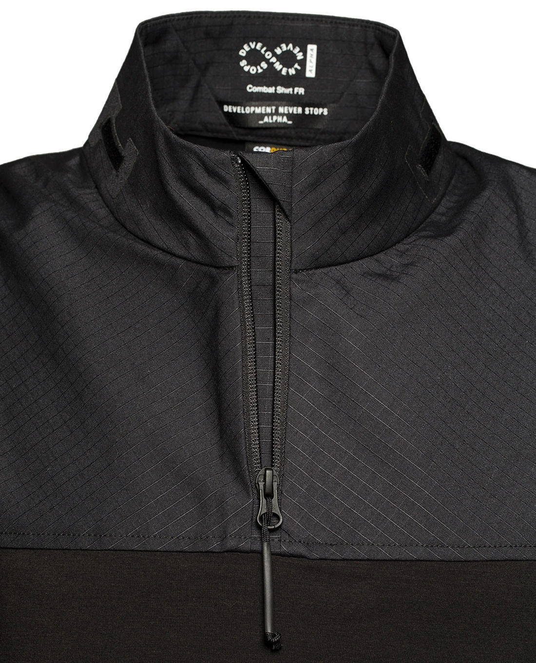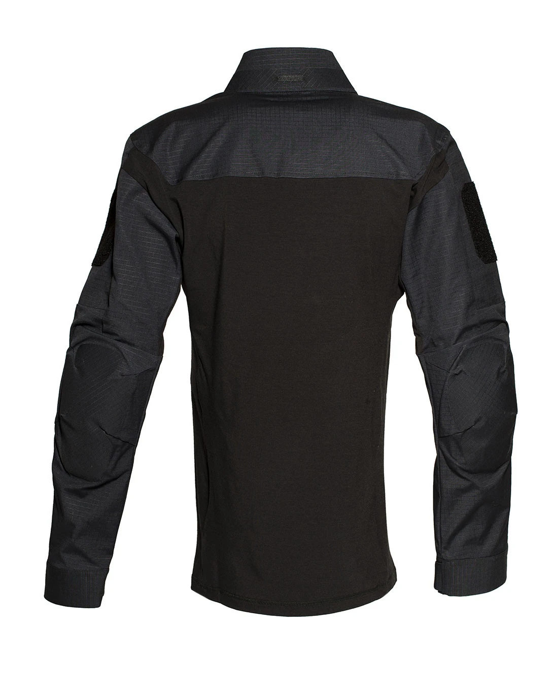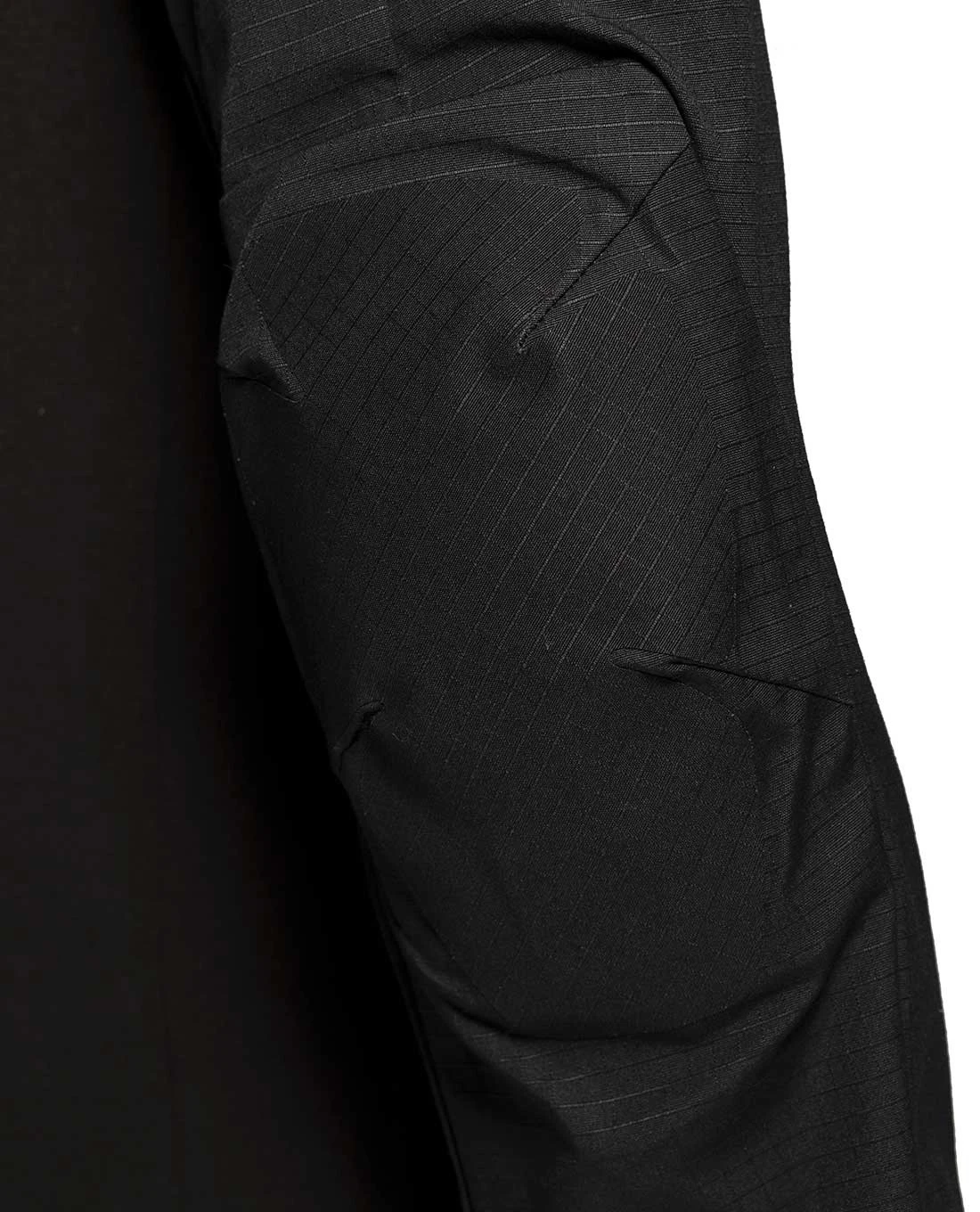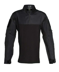 Wie es sich für ein Combat Shirt gehört, sind die Ellbogen des Hemdes verstärkt und mit austauschbaren Ellbogenpads versehen. Besonders flache, eingenähte Oberarmtaschen können auch beim Tragen mit Weste erreicht werden und fügen sich dem flachen Profil ein. Der Stehkragen mit Viertelreißverschluss ist anatomisch geschnitten und verbirgt eine Tasche für die Splitterschutzhaube im Nacken.