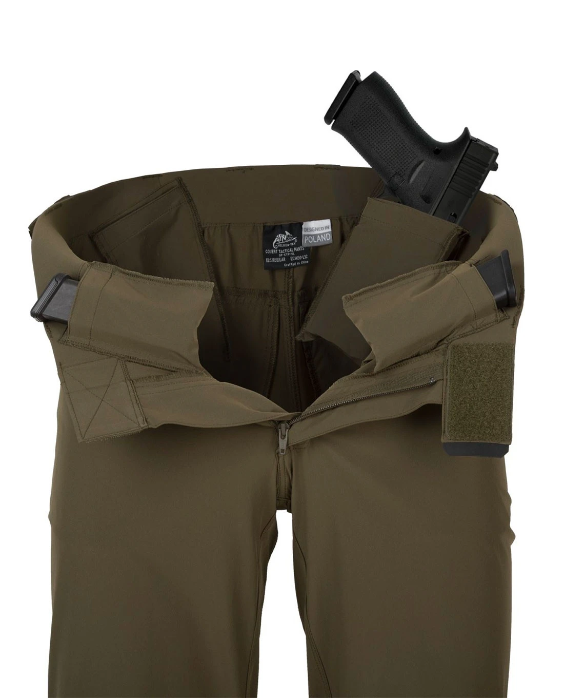 - Innentaschen können als IWB-Holster für kleine Pistolen verwendet werden