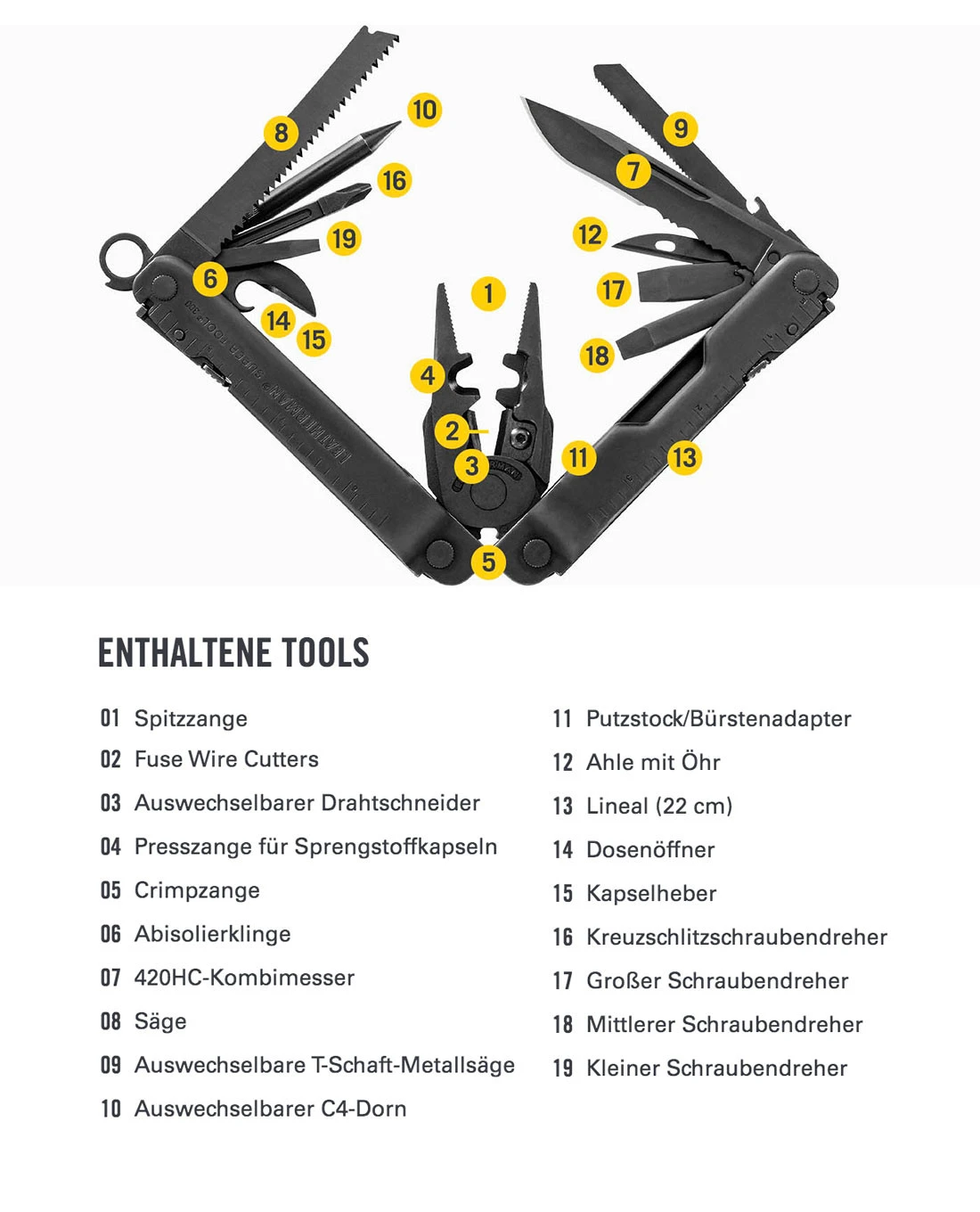 Das Multi-Tool aus schwarz oxidiertem Edelstahl ist mit einem austauschbaren Sicherungsdrahtschneider, militärischen Kappen-Crimper und C4-Stanze ausgestattet. Weiterhin sind ein Drahtabisolierer, 420HC Kombi-Messer, eine Säge und eine auswechselbare Metallsäge mit T-Schaft integriert. Die starke Quetschzange mit Reinigungsstab bzw. Bürstenaufsatz und verschiedenen Schraubendrehern ist außerdem unter militärischen Leistungsspezifikationen entwickelt.
