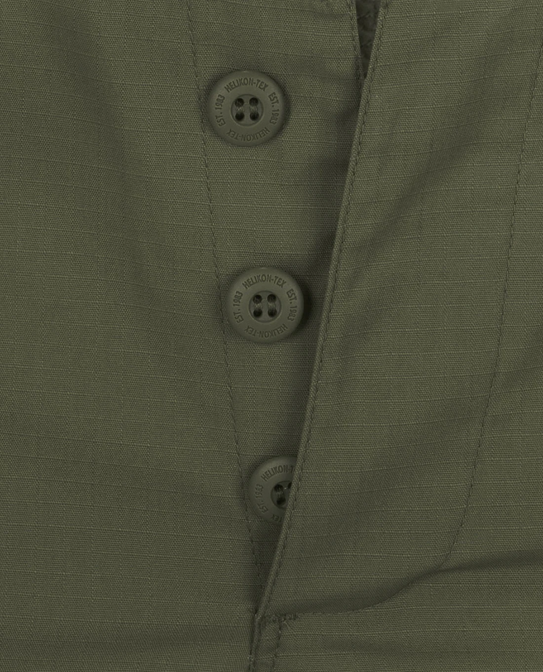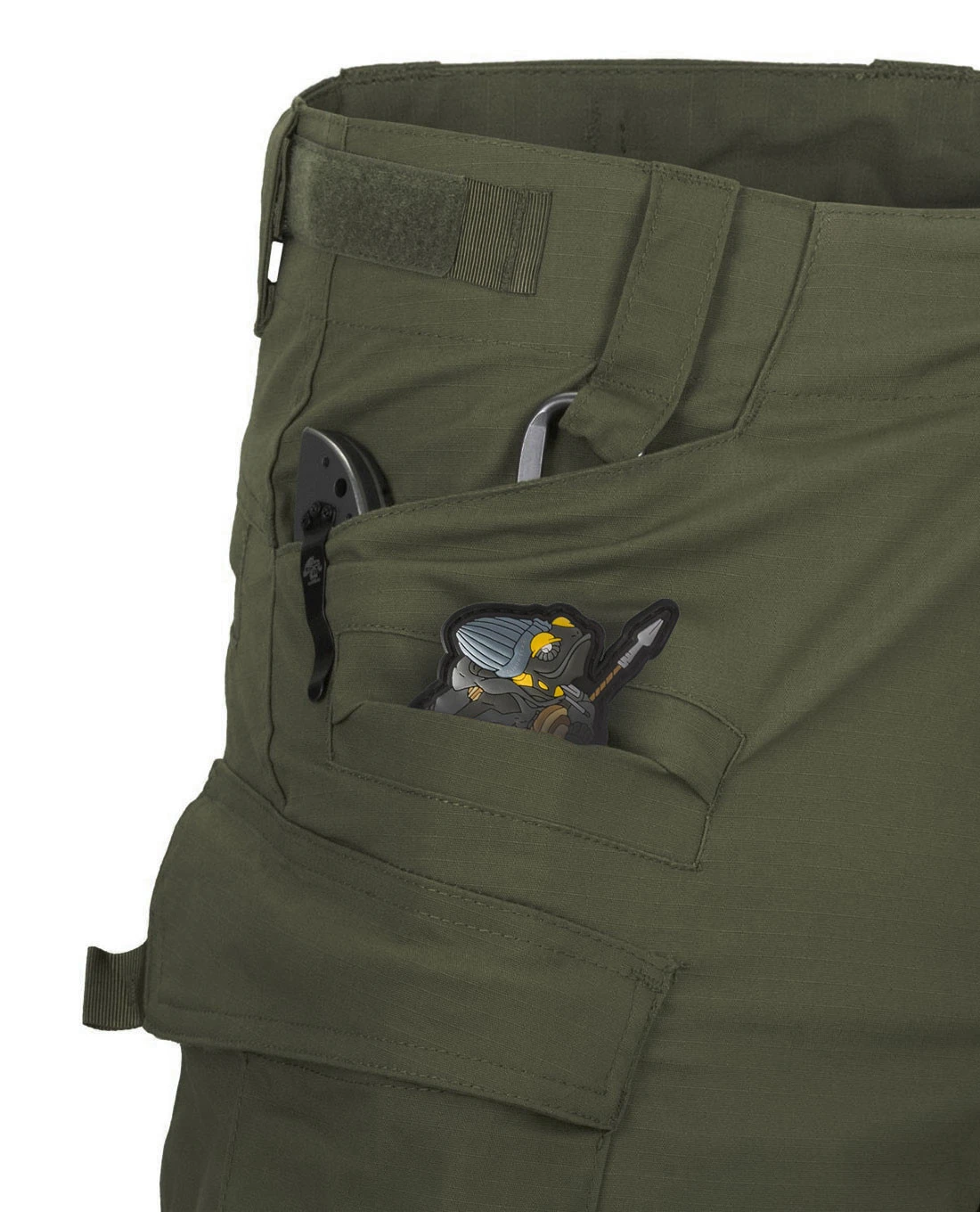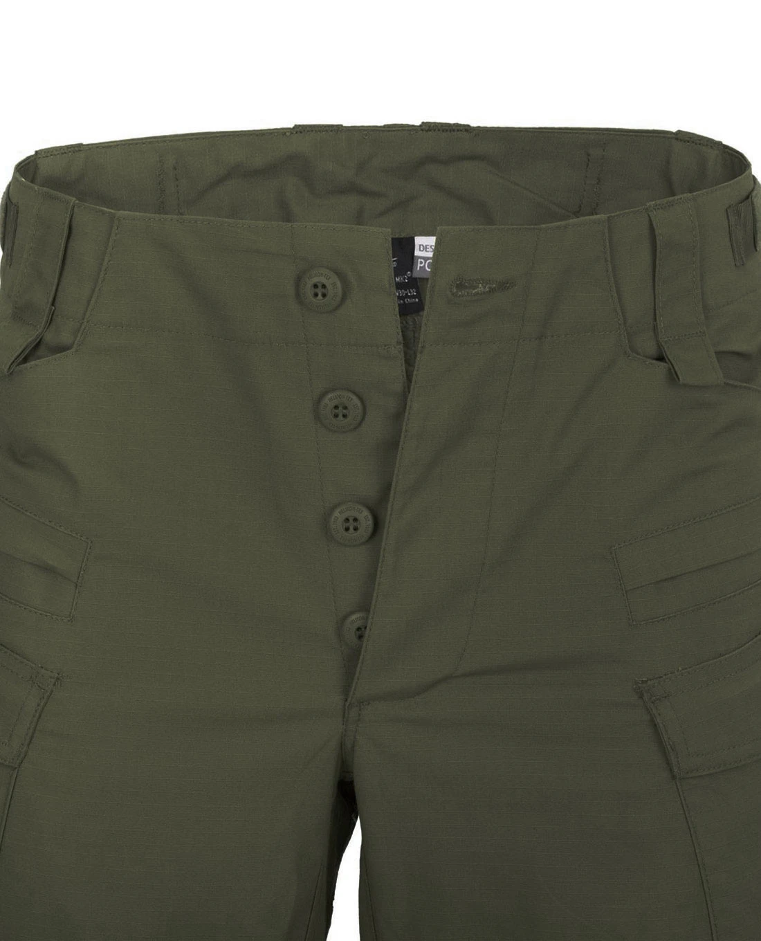 Um die Passform trotz Stretchanteil zu verbessern, kann der Taillenbund über seitliche Klettverschlüsse reguliert werden. Verschlossen wird sie nicht mit einem Reißverschluss, sondern mit den bewährten Knöpfen von Helikon-Tex.