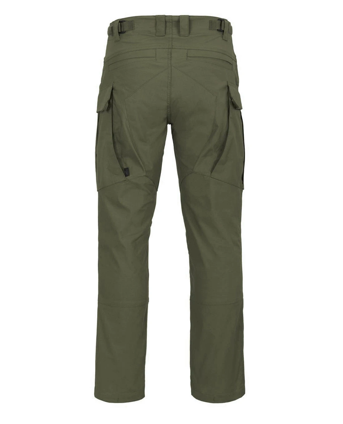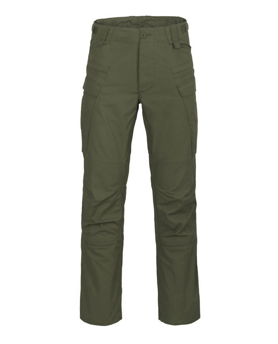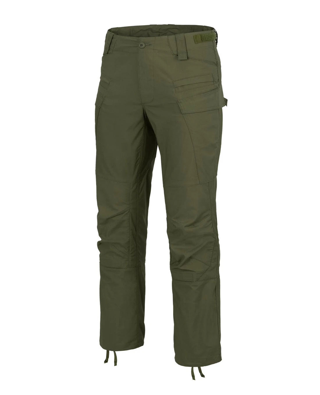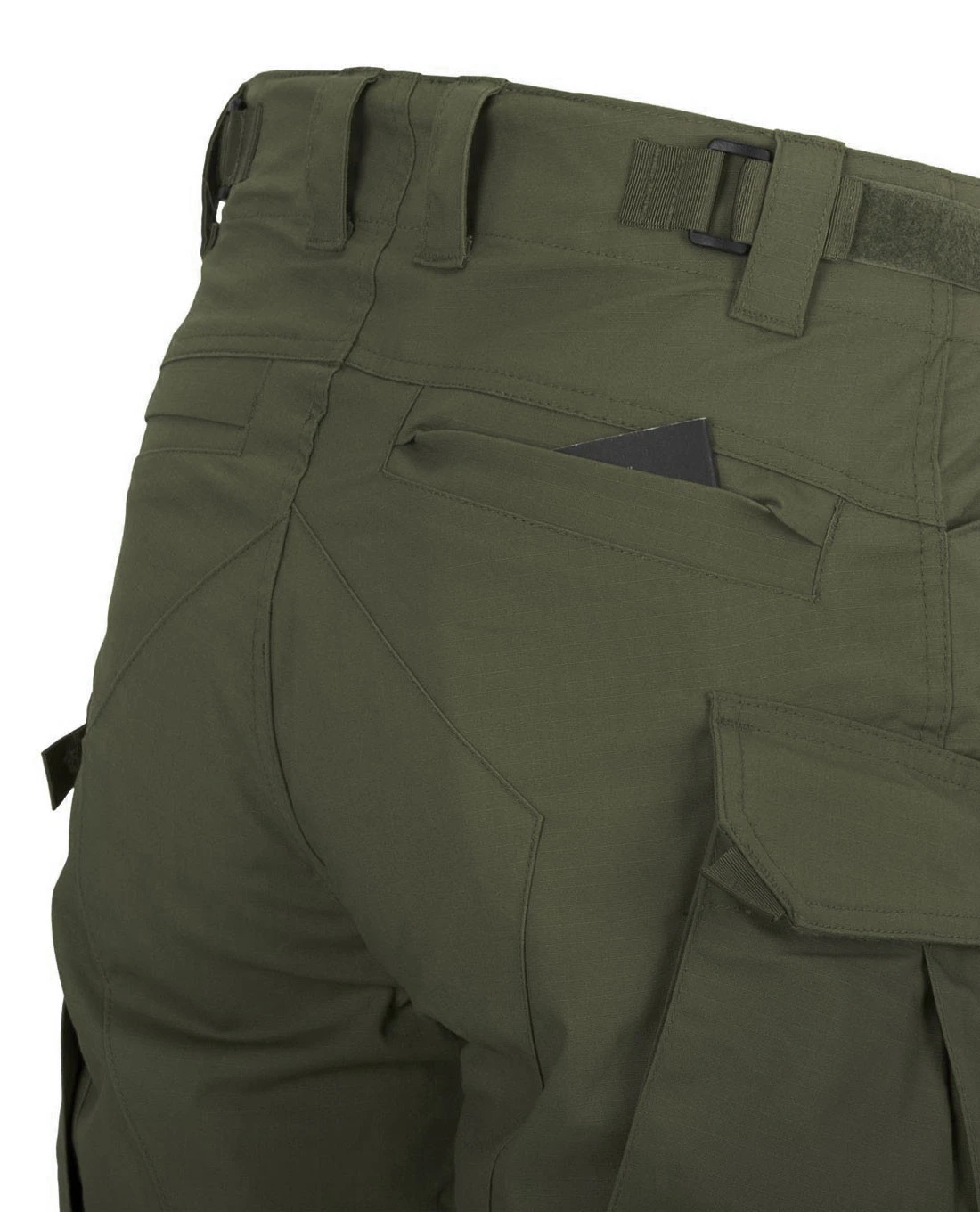 Um die Passform trotz Stretchanteil zu verbessern, kann der Taillenbund über seitliche Klettverschlüsse reguliert werden. Verschlossen wird sie nicht mit einem Reißverschluss, sondern mit den bewährten Knöpfen von Helikon-Tex.