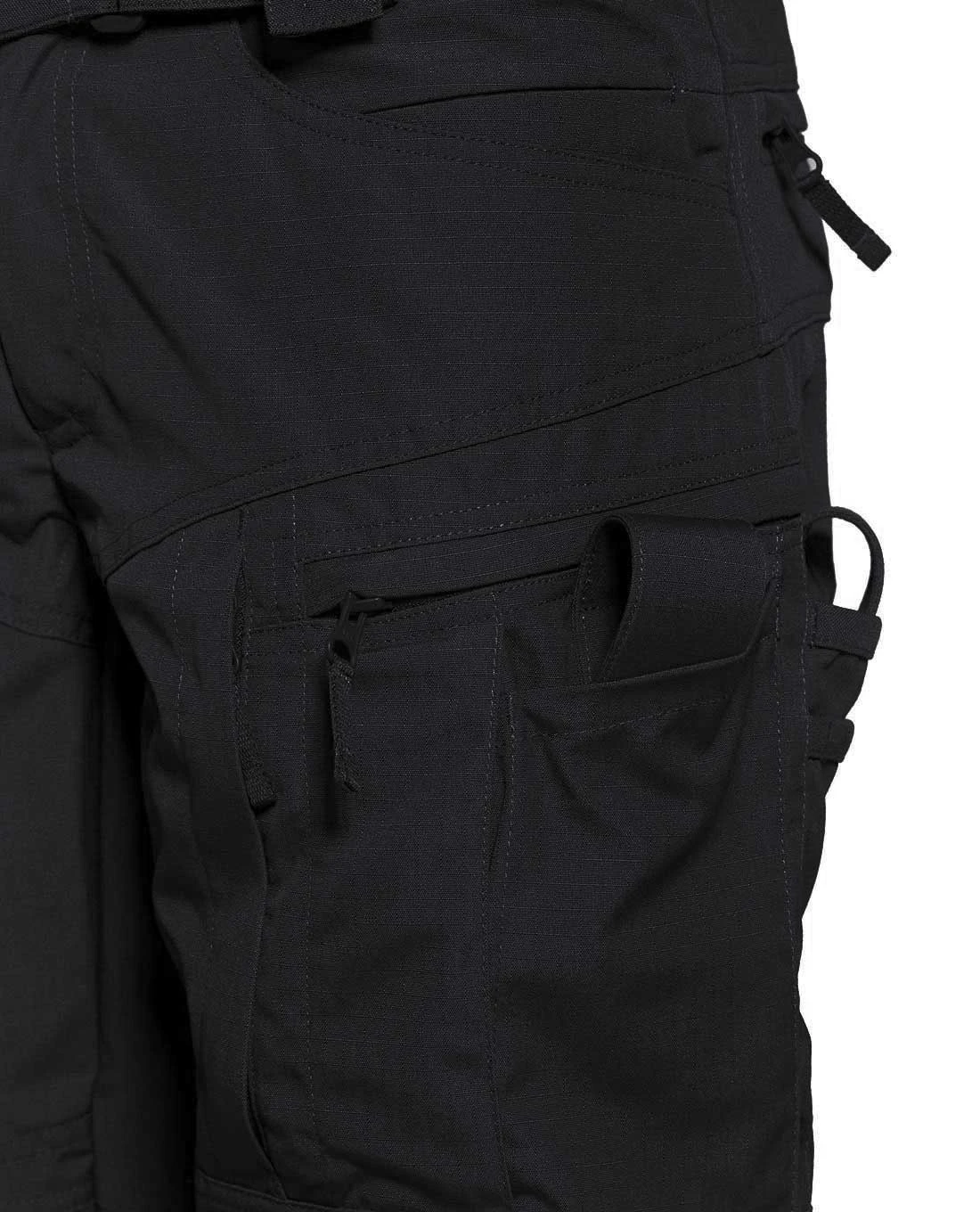 Für das Mitführern aller notwendigen Gear, EDC und Kleinteile sind 17 Taschen integriert: Multifunktionale Seitentaschen mit elastischen Innenfächern halten Kleinteile am Platz und sind zudem mit hochwertigen YKK-Reißverschlüssen ausgestattet, die einen doppelten Zugriff ermöglichen. Zwei Ausrüstungstaschen mit Sicherheitsriemen, zwei Magazin- bzw Messertasche mit Sicherheitsriemen, zwei Stifttaschen, zwei Gesäßtaschen und 2 große Beintaschen runden das Taschen Set-Up ab.