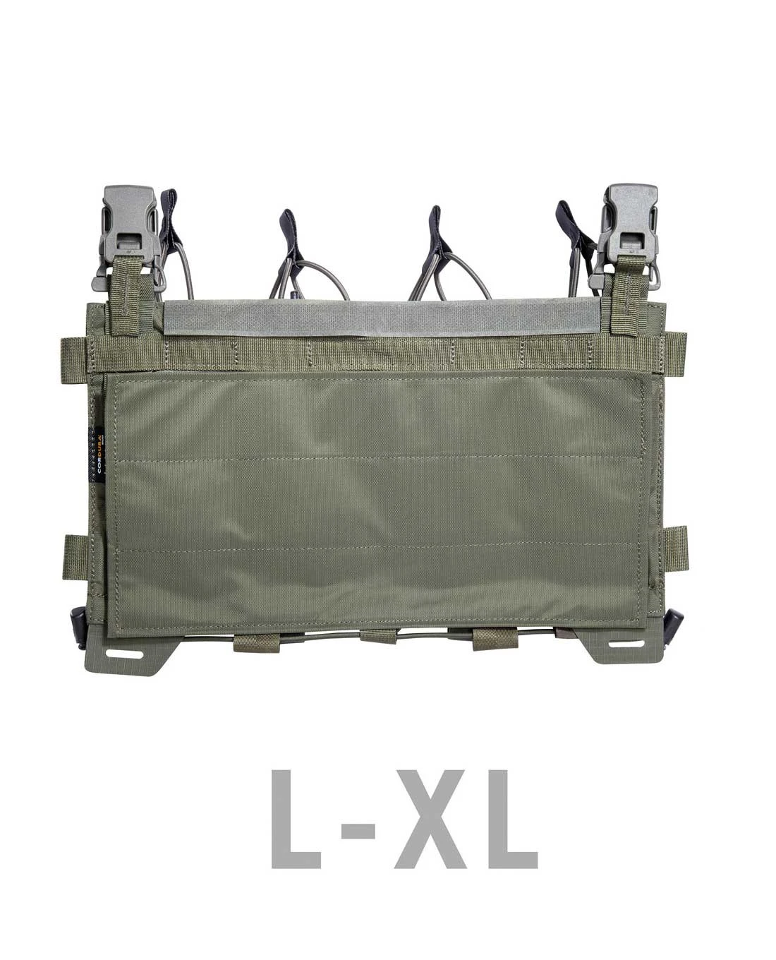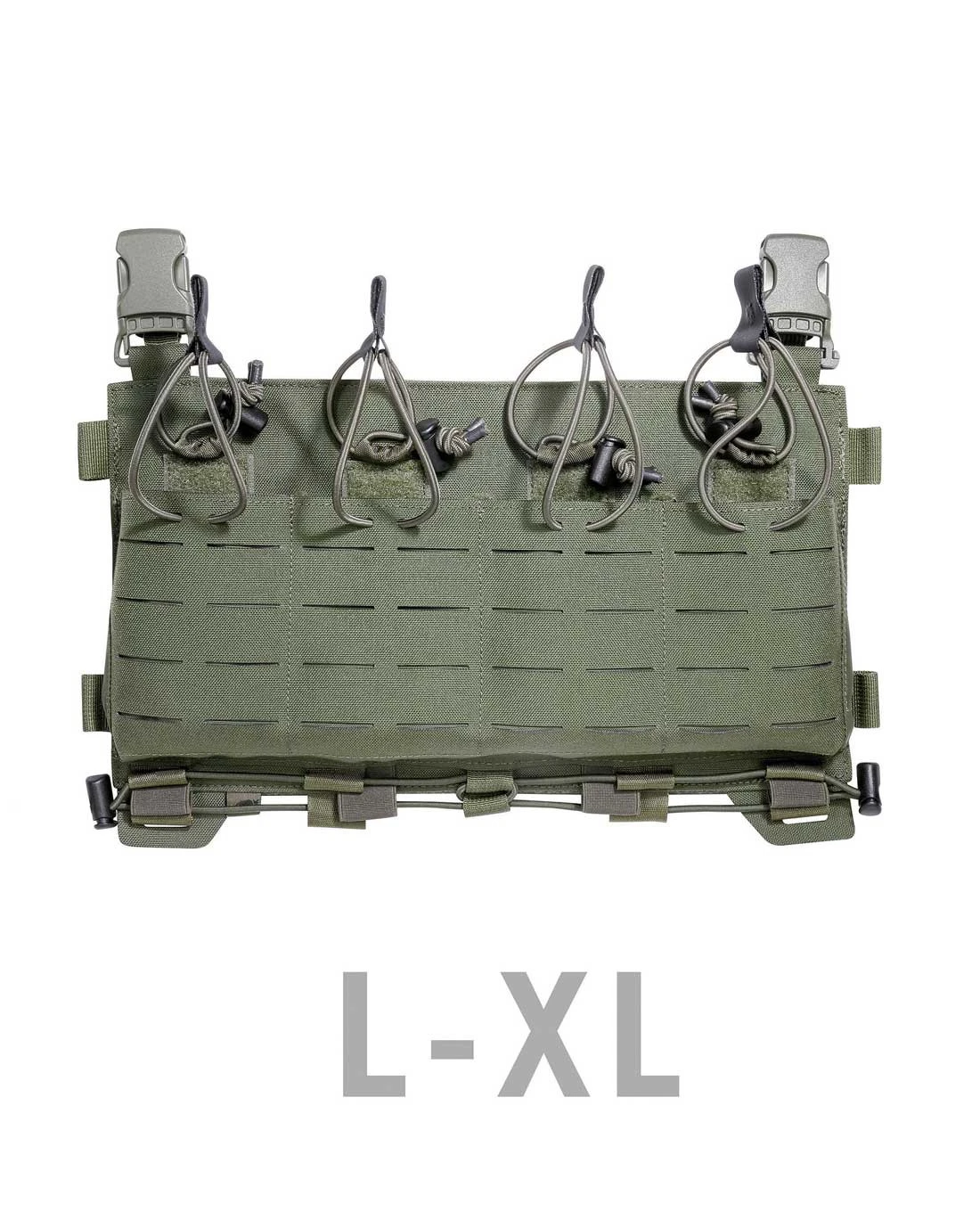 Je nach Größe S-M oder L-XL sind drei oder vier Magazintaschen für Magazine der Machart M4, G36 PMAG, Steyr etc. angebracht und jedes Magazin wird individuell durch ein Bungee-Cord gesichert. Die Frontseite des Carrier Mag Panel LC M4 ist vollständig mit Lasercut-M.O.L.L.E. Streifen bedeckt.
