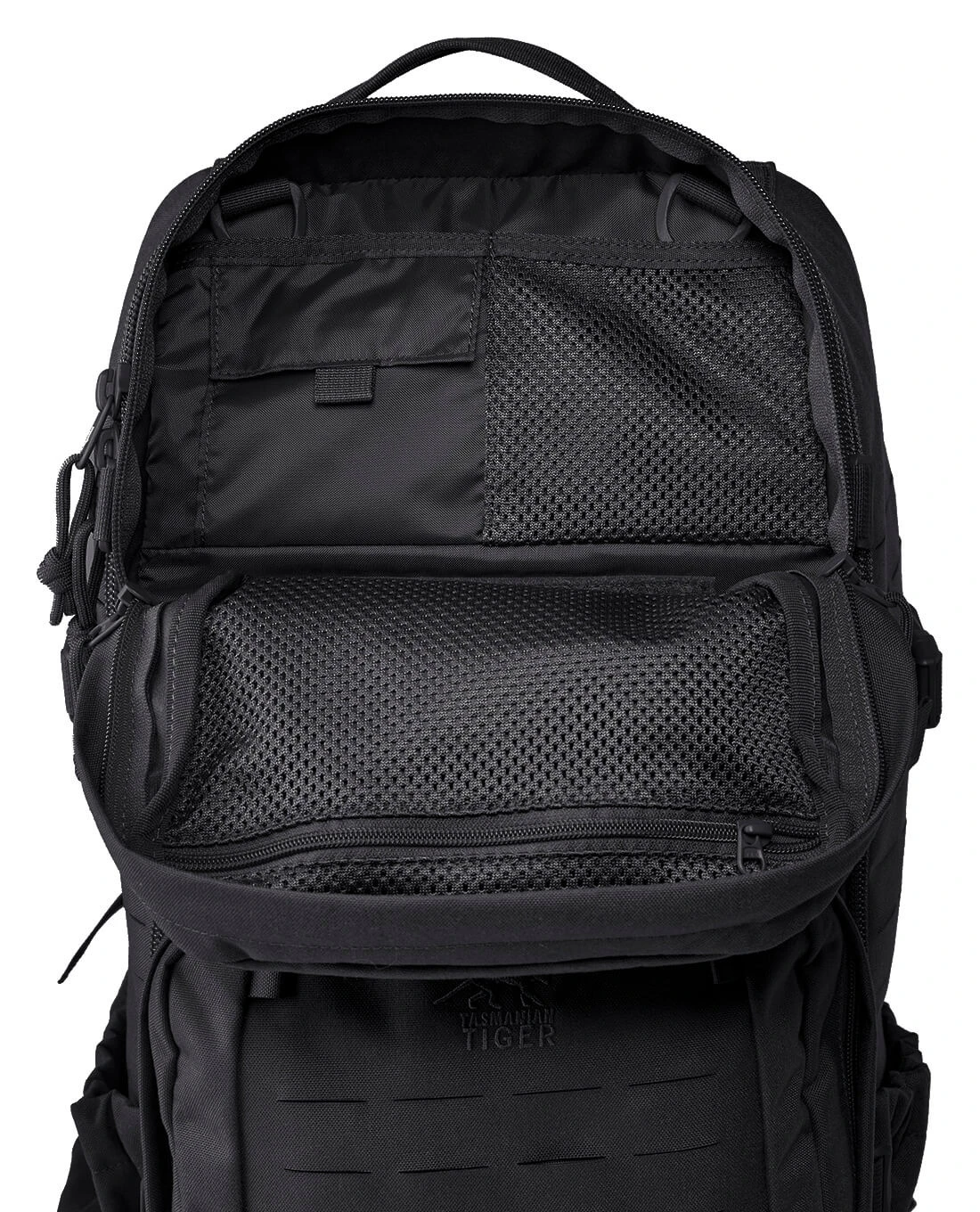 Zur Organisation im Inneren sind ein M.O.L.L.E. Klett im Inneren und eine durchsichtige Netz-Tasche integriert an oder in denen Kleinteile angebracht und sicher verstaut werden können. Magazintaschen und kleinerer Zubehör können aber nicht nur innen, sondern auch an den M.O.L.L.E. Schlitzen in Lasercut Ausführung an der Außenseite des Rucksacks befestigt werden. Selbst auf den beiden Zubehörtaschen auf der Front des Rucksacks verlaufen die Lasercut M.O.L.L.E. Schlitze, so dass der Rucksack geradezu komplett mit M.O.L.L.E. Kombinationsmöglichkeiten ausgestattet ist. Im Inneren des Hauptfachs ist zusätzlich eine Vorrichtung für ein Trinksystem integriert.