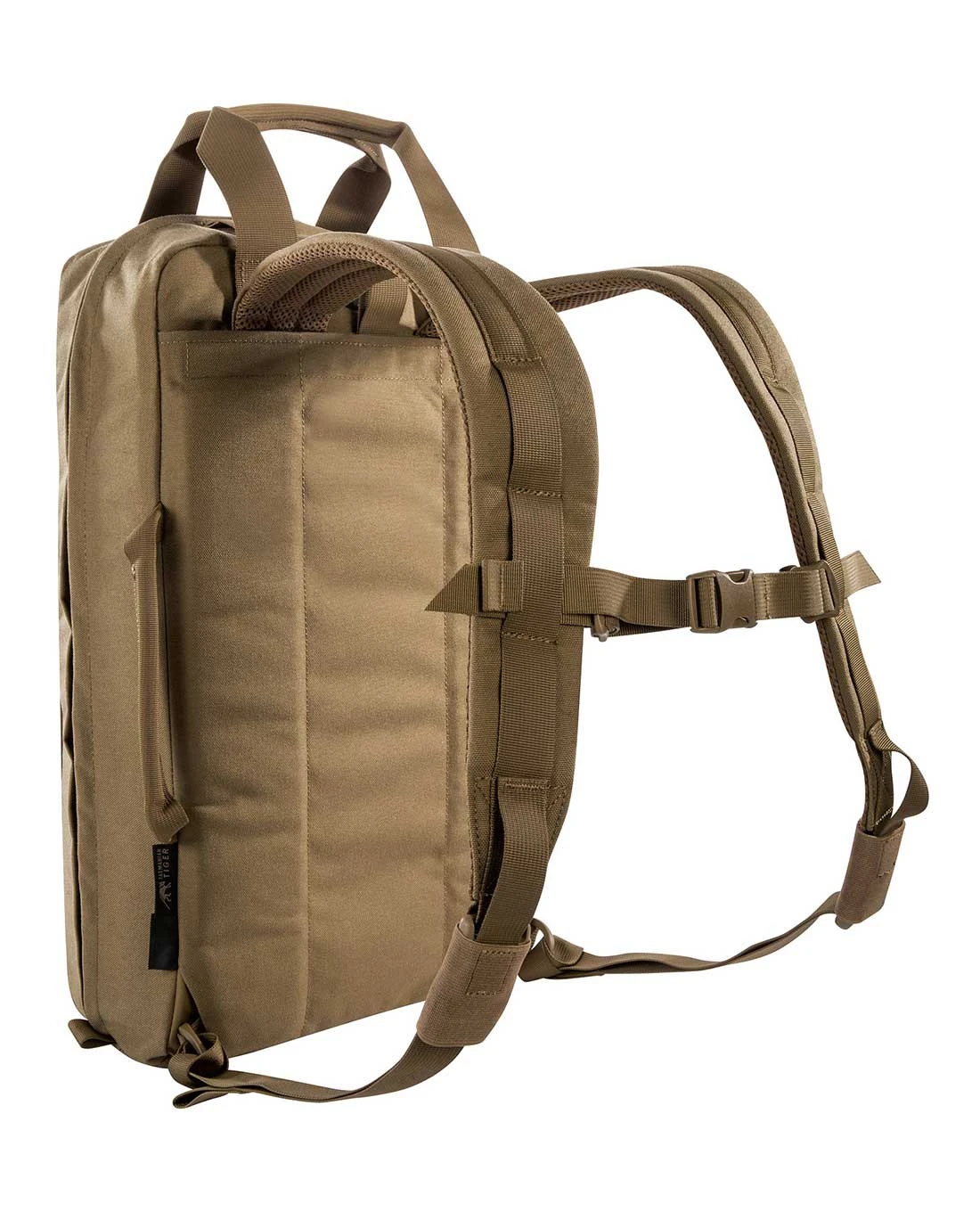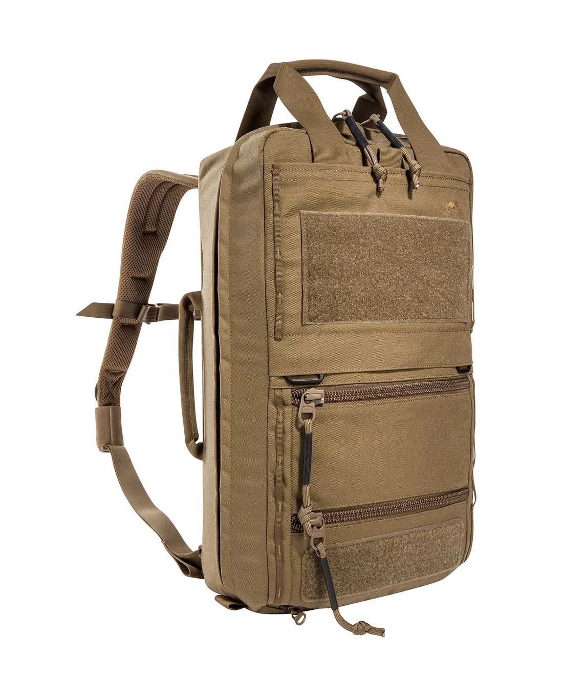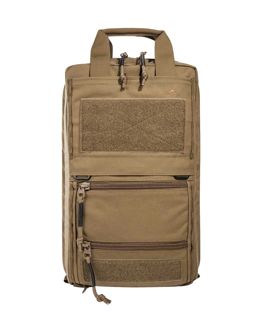 Zwei flache Reißverschlussfächer auf der Front sind außerdem für schnell erreichbare Dokumente und EDC geeignet. Auf der Front können zudem zusätzliche Taschen oder Panels in den beiden vorhandenen Haken eingehängt werden. Die beiden großen Patchflächen sind zur Bestückung mit ID Patches vorhanden, außerdem sind beschriftbare Klettstreifen und eine integrierte Sichtmarkierung enthalten.