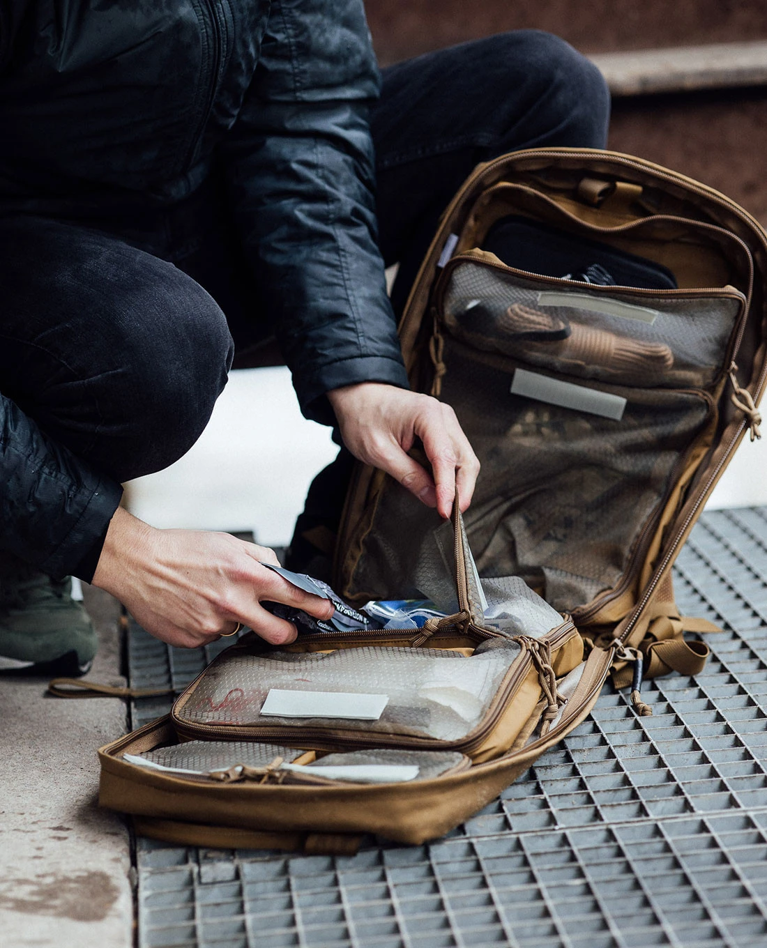 Der Zugang zum Hauptfach erfolgt über den vollständig aufziehbaren Reißverschluss. Im Hauptfach sind sechs Taschen in unterschiedlicher Größe und mit transparentem Deckel angeordnet. Zwei der sechs Taschen können herausgenommen werden, ihr Volumen verteilt sich auf 4 sowie 2,5 Liter. Die Innenseite des Hauptfachs ist außerdem mit einer großzügigen M.O.L.L.E-Klettfläche ausgestattet, so dass der Einsatzrucksack so modular wie möglich gepackt werden kann.