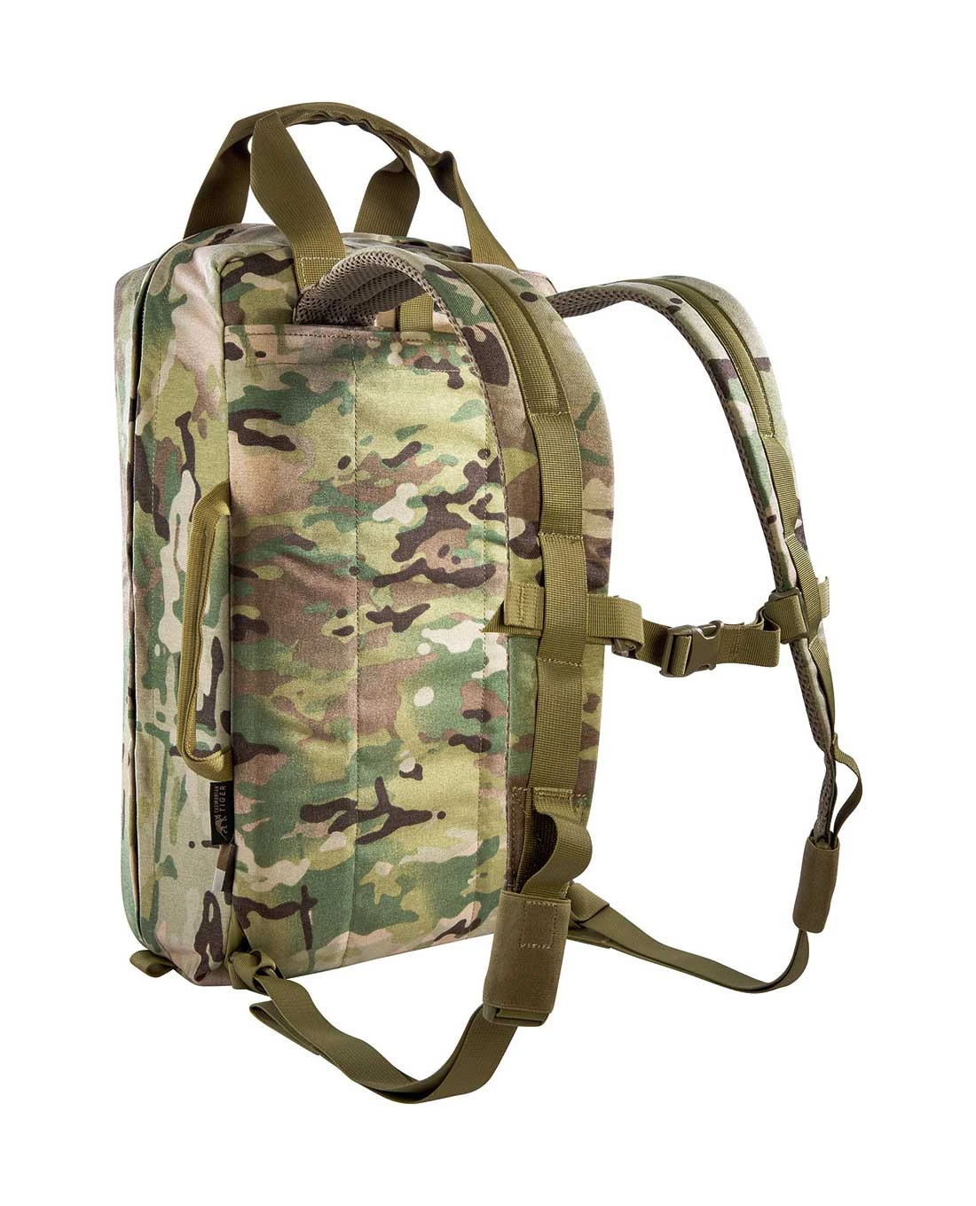 Der TT Survival Pack kommt aufgrund seiner Größe auch ohne aufwändiges Tragesystem aus und schützt den Rücken durch eine gepolsterte Rückseite vor Spitzen und Kanten. Die gepolsterten Schultergurte sowie die Tragegriffe lassen sich auch in den anliegenden Reißverschlusstaschen verstauen, wenn der Pack etwa im Fahrzeug oder Flugzeug verstaut wird. Der dünne, stabilisierende Brustgurt kann in der Höhe verstellt werden.