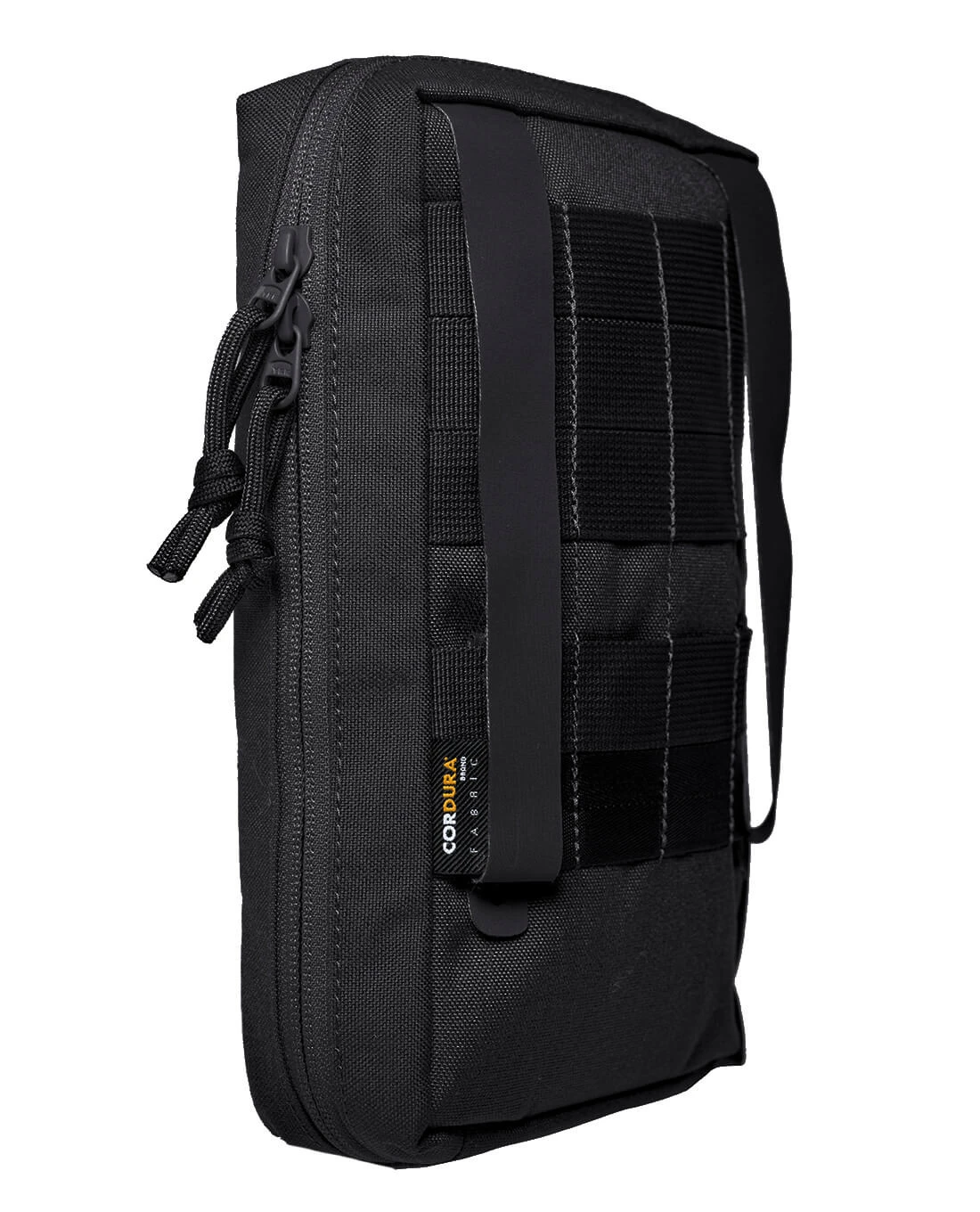 Innen können Kleinteile in der einsehbaren Netztasche organisiert werden. Verschiedene elastische Schlaufen und ein Gurtbandsystem können außerdem zur Befestigung von Kleinteilen benutzt werden. Eine Flauschfläche befindet sich zusätzlich im Inneren, an der kleine Teile oder Patches befestigt werden können. Auf der Vorderseite können Dokumente in einem flachen Reißverschlussfach aufbewahrt werden. Es werden vier M.O.L.L.E.-Schlaufen benötigt, um die Tasche vertikal zu befestigen.