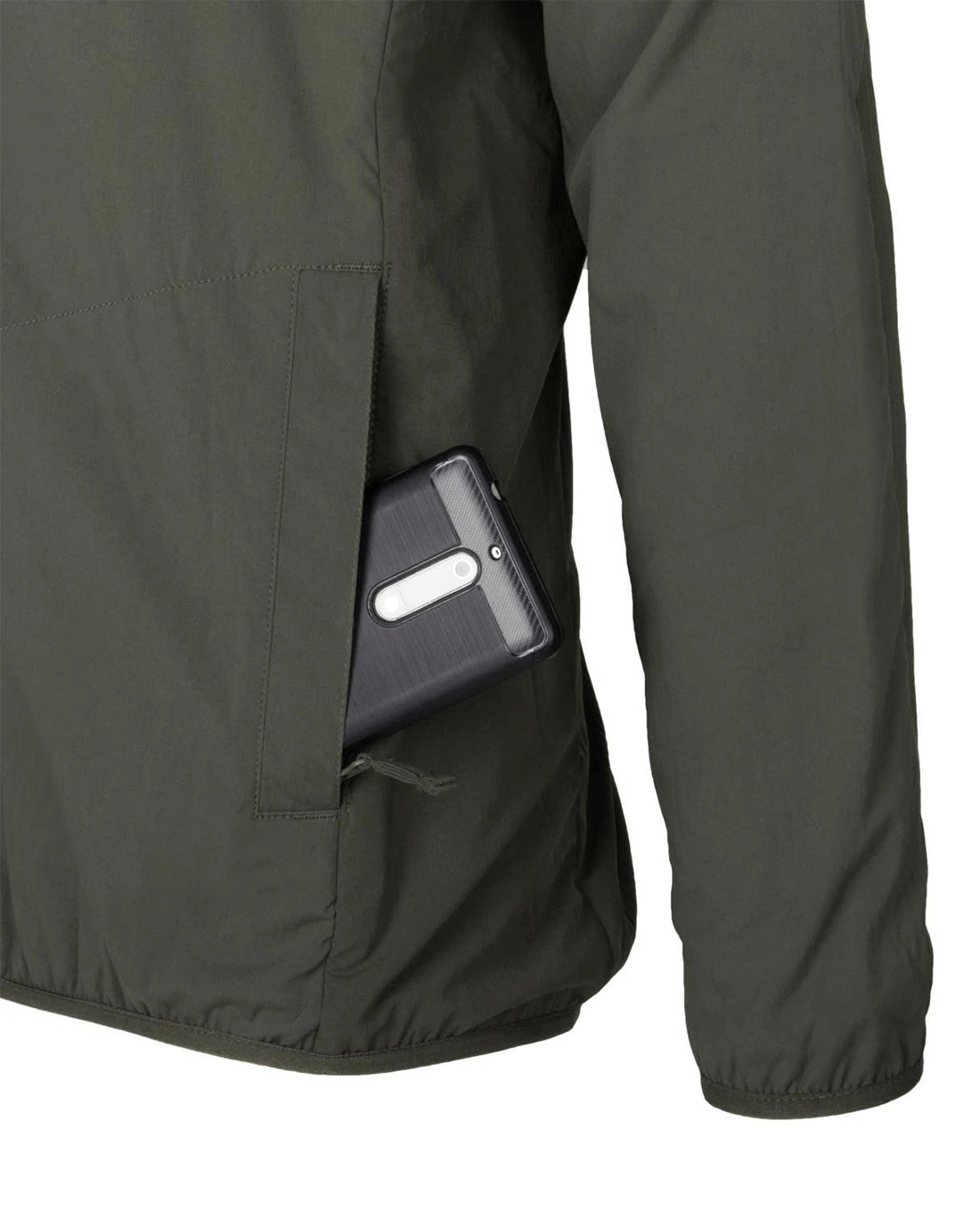 - Elastische Bänder am Kapuzenrand, an den Ärmelbündchen und an der Unterseite der Jacke